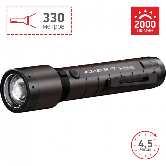 LED Lenser P7R Signature очень похож на P7R Core. Он светит таким же холодным светом и заряжается с помощью магнитной системы зарядки. Однако у него темно-коричневый корпус, выполненный в премиальном дизайне, а рядом с контактами расположен дополнительный красный светодиод. Выбор режима осуществляется не только нажатием на кнопку, но и передвижением кольцевого переключателя. Встроенный светодиод имеет индекс цветопередачи 80 – это больше, чем у аналогичной модели серии Core, и меньше, чем у WORK. Более высокое значение позволяет более точно распознавать цвета объектов в темноте, а также уменьшает нагрузку на глаза. Максимальный световой поток устройства составляет 2000 Лм, что значительно больше, чем в предыдущей версии. Благодаря поддержке интеллектуальной системы освещения Smart Light Technology яркость между режимами наращивается плавно. Последовательность включения режимов может настраиваться индивидуально. Всего 8 режимов свечения: по четыре с постоянным и мерцающим светом. При уровне заряда менее 25 процентов автоматически переходит в экономичный режим. Благодаря поддержке технологии Flex Sealing Technology фонарь выдерживает кратковременное погружение в воду. Для удобства хранения и переноски в комплекте к нему идет чехол, темляк и настенное крепление, а к корпусу прикреплен металлический зажим.
